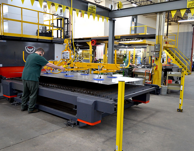 We stock a variety of sheet materials on our roll out racks. A vacuum lift is used to transport the sheet material to the fiber laser cutting table while the fiber laser is in operation.